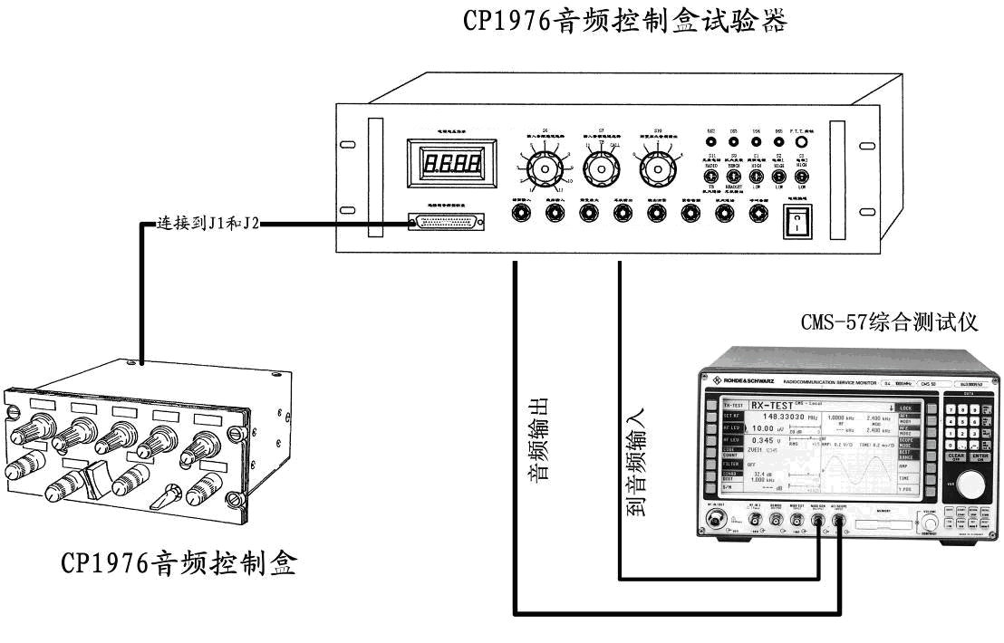 图示连接:1、STD-CP1976-1音频控制盒试验器;2、CMS57综合测试仪;3、CP1976音频控制盒。