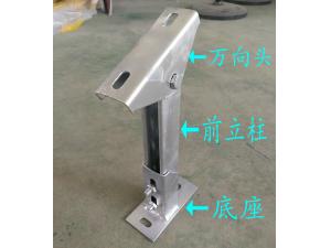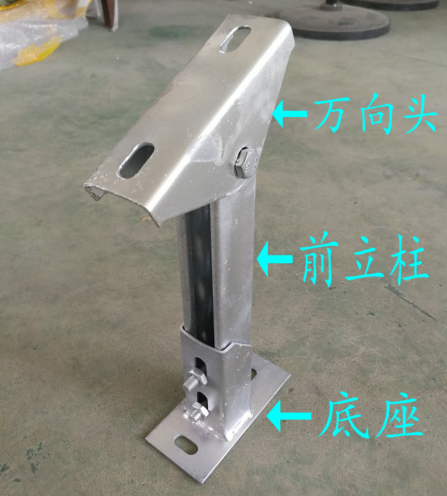 | 太阳能光伏板安装支架是一种活动式拼装安装支架,安装支架包括“STD-AZJ-ZX-XXX(XXX表示长度,单位是cm)纵向支架杆”、“STD-AZJ-HX-XXX(XXX表示长度,单位是cm)横向支架杆”、“STD-AZJ-QLZ-XXX(XXX表示长度,单位是cm)前立柱”、“STD-AZJ-HLZ-XXX(XXX表示长度,单位是cm)后立柱”、“STD-AZJ-FZB辅助连接板”用于将安装支架与辅助立杆之间连接用、“STD-AZJ-WXT万向头”用于前立柱和后立柱与纵向支架杆连接用、“STD-AZJ-DZ安装支架底座”用于固定前立柱和后立柱与地面基础桩用、“STD-AZJ-ZXYK安装架中心压扣”用于在横向支架杆中间位上固定两个太阳能板之间使用、“STD-AZJ-BYK安装架边框压扣”用于在横向支架杆两头边上固定太阳能板之间使用、“STD-AZJ-DB压扣垫板带有螺口用于放置在横向支架杆内固定边框压扣和中心压扣使用。用户订购安装支架时需计算好每个部件的长度,万向头不可改变长度,前立柱最小程度要保留4个固定螺丝孔位,可根据需要配置数量,横向杆和纵向杆长度要根据用户安装的太阳能板规格和数量确定长度,后立柱要根据用户安装所在地理位置确定太阳能板与太阳角度后再确定后立柱长度。 |
